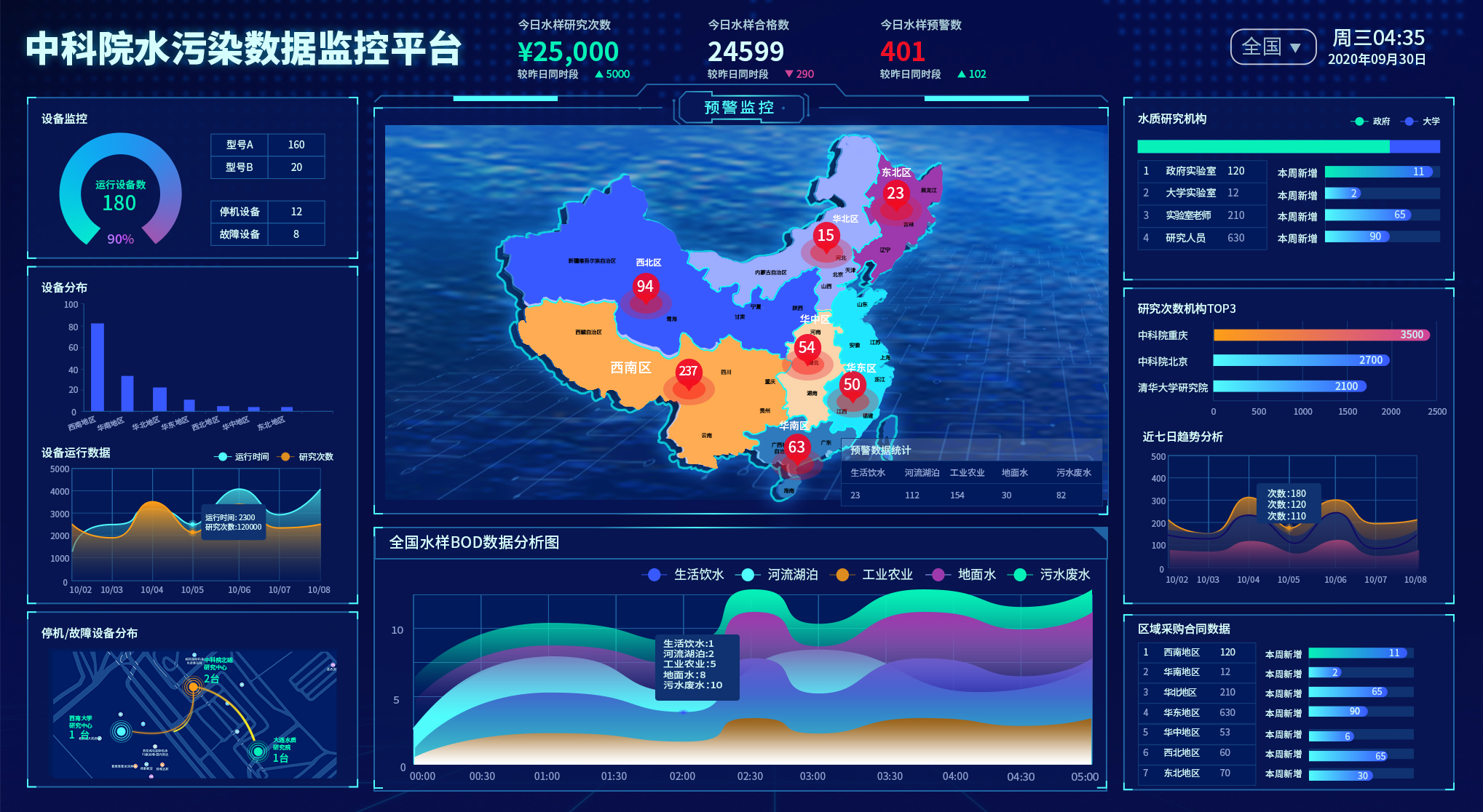 云平臺的主顯示界面可實時動態顯示儀器的運行狀態、儀器的全國分布狀態、在線水質測試情況,用戶界面可實時上傳下載用戶數據,便于管理,耗材更新及數據分享功能,后臺維護界面可收集用戶授權數據,進行大數據分析,管理云平臺及推送更新信息;云平臺將儀器、用戶以及監測點通過大數據傳輸構建到一起,為智慧水生態環境的發展提供有力的保障。
