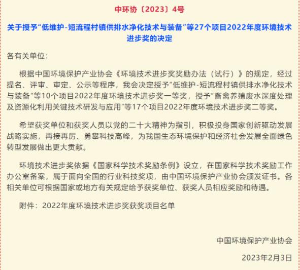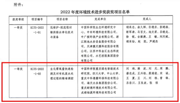 近日,中國(guó)環(huán)境保護(hù)產(chǎn)業(yè)協(xié)會(huì)發(fā)布《關(guān)于授予“低維護(hù)-短流程村鎮(zhèn)供排水凈化技術(shù)與裝備”等27個(gè)項(xiàng)目2022年度環(huán)境技術(shù)進(jìn)步獎(jiǎng)的決定》(中環(huán)協(xié)〔2023〕4號(hào)),由我司參與,中國(guó)科學(xué)院重慶綠色智能技術(shù)研究院牽頭的項(xiàng)目“生化需氧量快速檢測(cè)及對(duì)有機(jī)廢水處理過(guò)程的精準(zhǔn)調(diào)控”榮獲2022年度環(huán)境技術(shù)進(jìn)步獎(jiǎng)一等獎(jiǎng)。