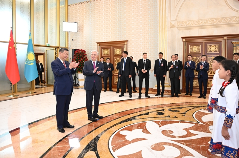 當地時間6月16日中午,國家主席習近平乘專機抵達阿斯塔納,應哈薩克斯坦共和國總統托卡耶夫邀請,出席第二屆中國—中亞峰會。這是在機場貴賓樓內,兩國元首共同欣賞哈薩克斯坦少年兒童的文藝表演。新華社記者 謝環馳 攝
