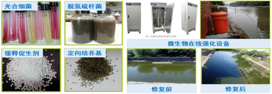 采用自主研發的微生物在線投加裝備、靶向脫氮促生劑和電磁波激活等技術,原位強化黑臭水體中氮磷等污染物的去除,已在浙江諸暨、舟山、平湖等河道生態治理工程中應用。